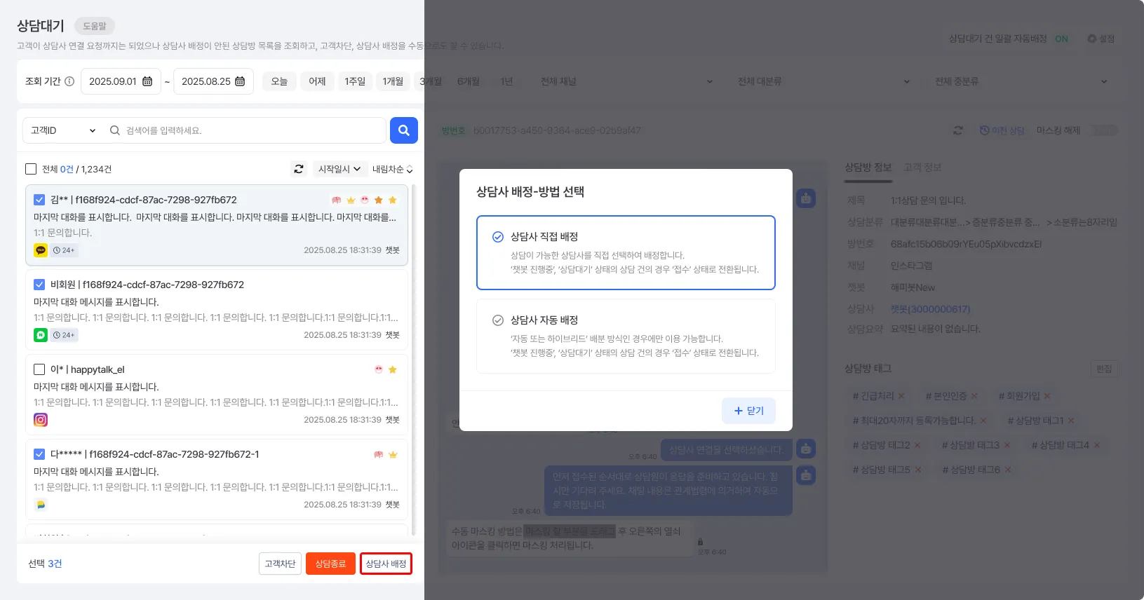 Step 3. [상담사 배정-방법 선택] 팝업에서 상담사 배정 방법을 선택