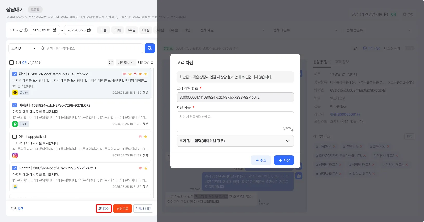 차단은 고객 단위로 적용되며, 차단된 고객의 다른 상담방에서도 고객정보 탭에 차단 아이콘이 표시됩니다.