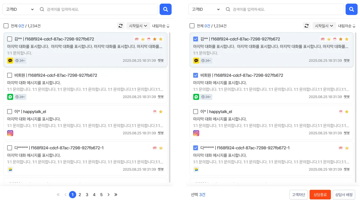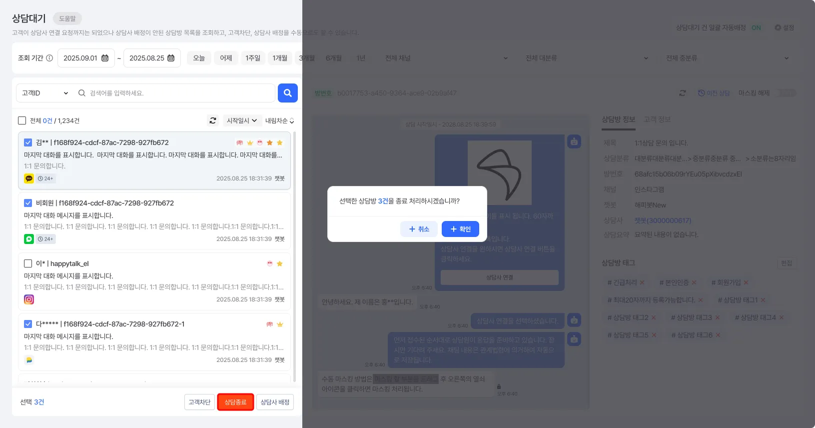 여러 상담방을 동시에 선택하여 상담 종료, 고객차단, 상담사 배정 업무를 처리합니다.
